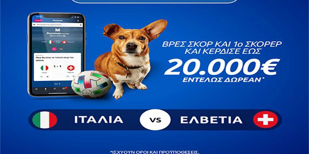Βρες το σκορ και τον 1ο σκόρερ στο Ιταλία-Ελβετία και κέρδισε έως 20.000€ εντελώς δωρεάν*! Το Stoiximan Master μοιράζει εγγυημένα 10.000€ κάθε μέρα, ωστόσο χθες στο Γαλλία-Γερμανία δεν υπήρξε νικητής. Συνεπώς το χθεσινό δεκαχίλιαρο προστίθεται στο Ιταλία-Ελβετία που μοιράζει 20.000€! (ΠΑΤΑ ΕΔΩ)