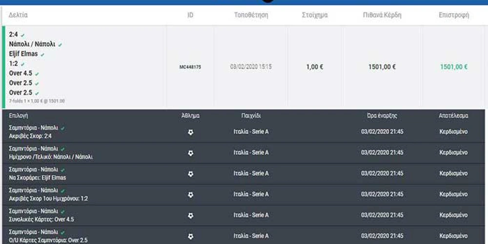 Αξίζει να σημειωθεί πως η τύχη του χαμογέλασε στο τέλος καθώς έπιασε το στοίχημα με τις 2 κίτρινες κάρτες που πήρε η Νάπολι στο 93’ και στο 95’ και με το γκολ που σημείωσε η ίδια ομάδα στο 98’!