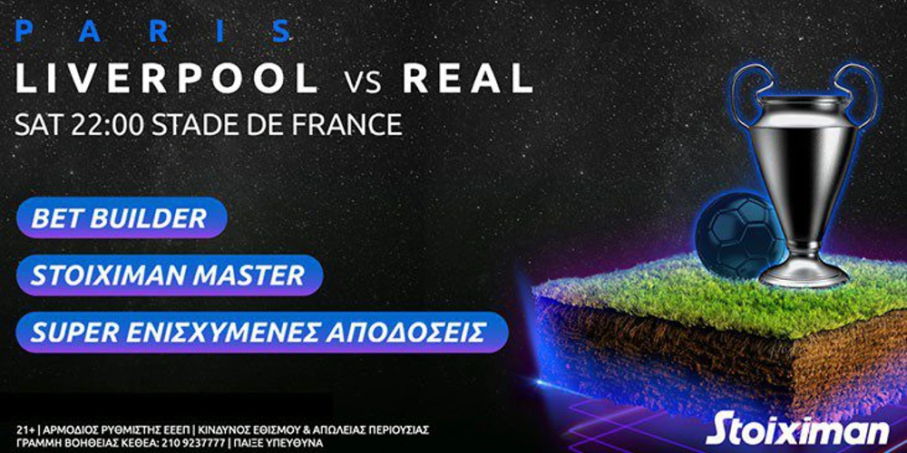 Δύο ομάδες με εκτυφλωτική λάμψη στο παγκόσμιο ποδοσφαιρικό στερέωμα συγκρούονται το βράδυ του Σαββάτου, στην πόλη του φωτός! Το 'Stade de France' στο Παρίσι φιλοξενεί τον τελικό του Champions League, με τις Λίβερπουλ και Ρεάλ Μαδρίτης να διεκδικούν το βαρύτιμο τρόπαιο σε ένα ματς που έρχεται απόψε στις 22:00 με Stoiximan Master: Βρίσκεις το τελικό σκορ και τον πρώτο σκόρερ στο παιχνίδι και κερδίζεις*!