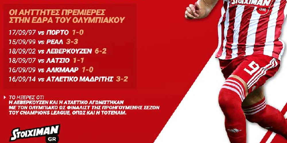 Ενδιαφέρον παρουσιάζει και η 18η Σεπτεμβρίου καθώς σαν σήμερα το 2002 ο Ολυμπιακός διέλυσε με 6-2 σε πρεμιέρα τη Λεβερκούζεν, ενώ έμεινε και αήττητος το 2007 στο Καραϊσκάκης κόντρα στη Λάτσιο (1-1). Θα τριτώσει το καλό τη συγκεκριμένη ημέρα; Θα τριτώσει το καλό και όταν υποδέχεται τη φιναλίστ της περασμένης χρονιάς;